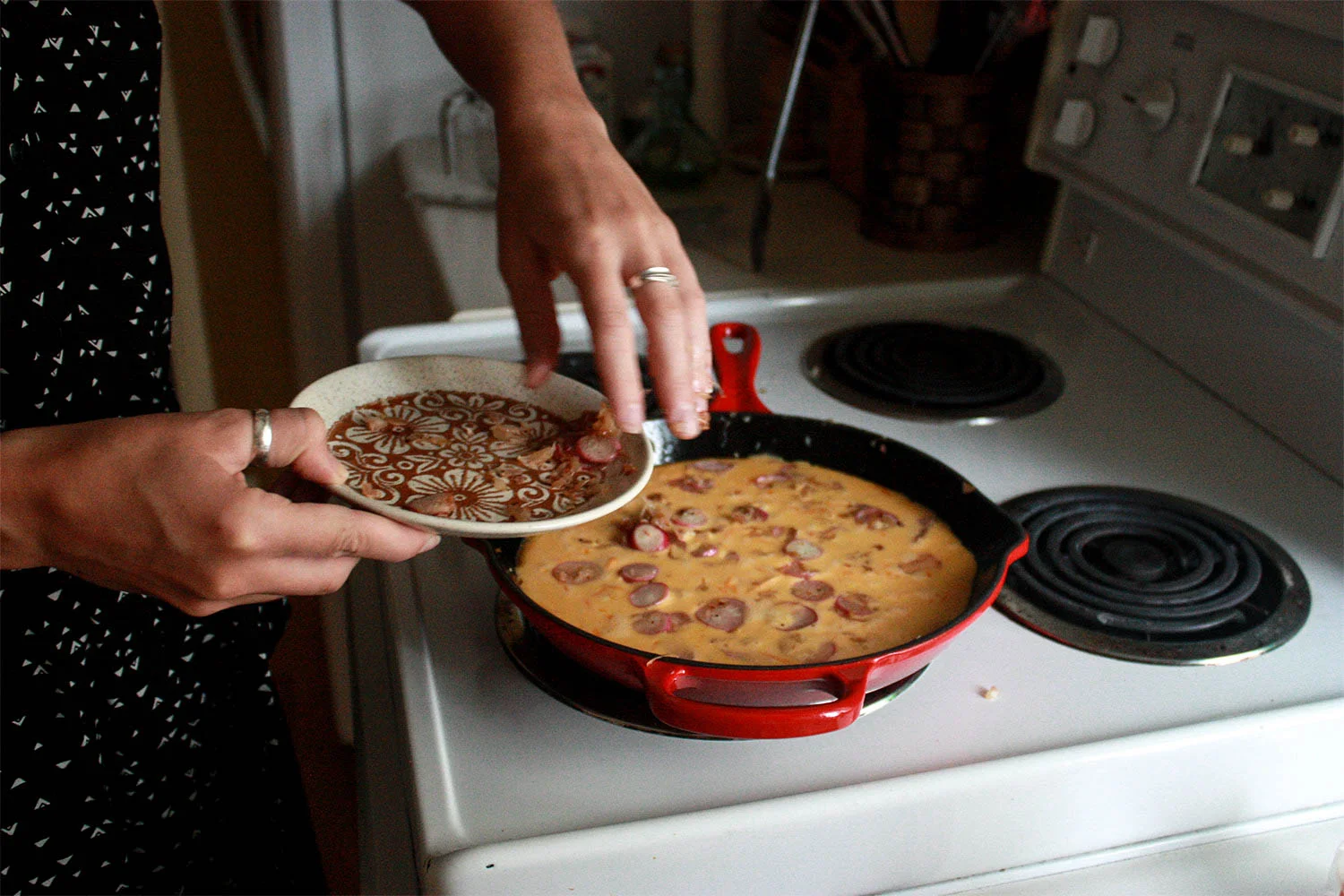 Make sure that these ingredients are thoroughly sautéed, since they'll cook very little once combined with the egg mixture. The onion should be translucent, the garlic fragrant, and the radishes will have lost most of their bitterness. Taste those suckers!