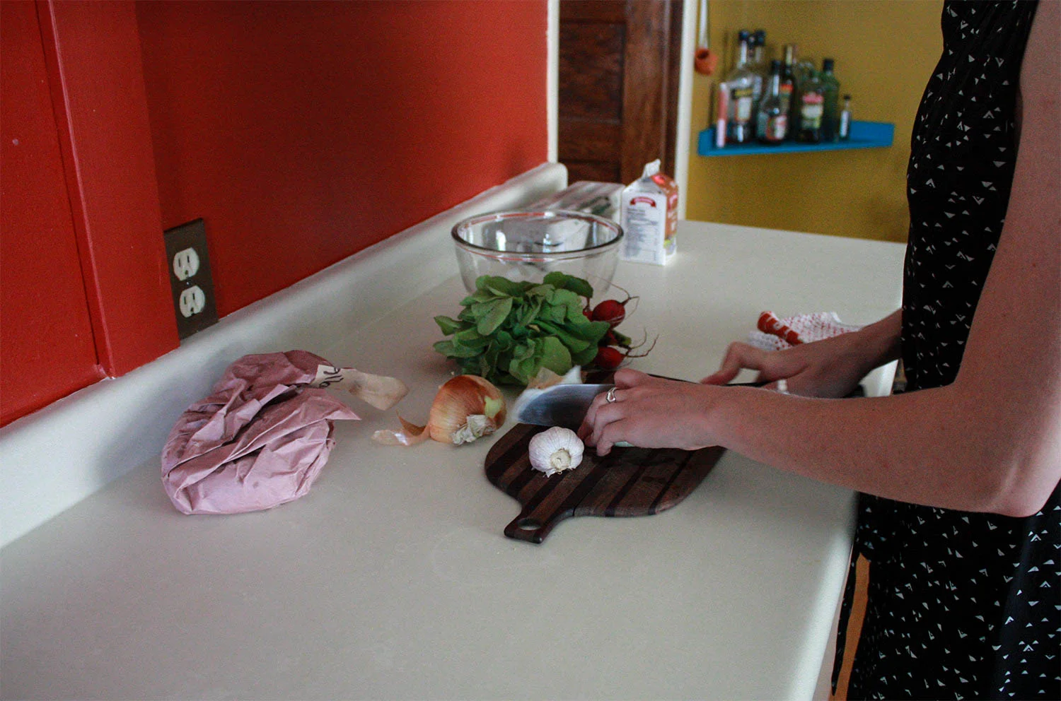 Begin by chopping up and sautéing the onion, garlic and radishes. A cast iron skillet is best for frittatas, since they hold heat well and are oven friendly. (The lovely one featured in these photos is Le Creuset purchased from The Happy Cooker in Osborne Village.) You'll know the pan's ready when water droplets sizzle on it. At that point, add your preferred cooking oil, and once the oil begins to shimmer, add the onion, radish and garlic last.